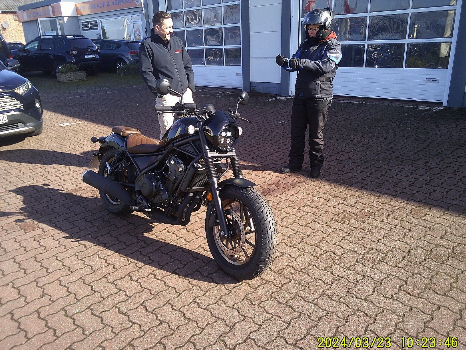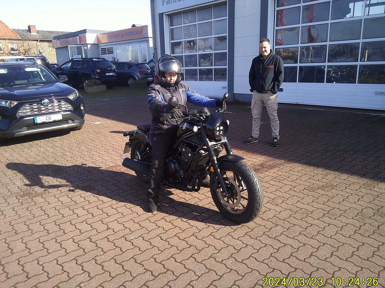 Heute am 23.03.2024 ihr neues Motorrad abgeholt. Es ist eine Honda CMX 500 Rebel Special Edition. Neues 2024er Modell. Mit 1 Kilometer hat Conny sie dann übernommen.